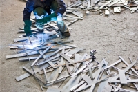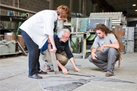 Franca Ghitti ha realizzato per Bendotti un’installazione utilizzando elementi di scarto che vanno a formare due pannelli verticali e due composizioni a terra disposte in modo simmetrico. I due pannelli hanno un ritmo regolare a citazione della scansione programmata della produzione industriale, con inserimenti di spazi circolari abitati da figure che rappresentano la comunità al lavoro. A terra i due elementi rappresentano una meridiana ed un tondo.